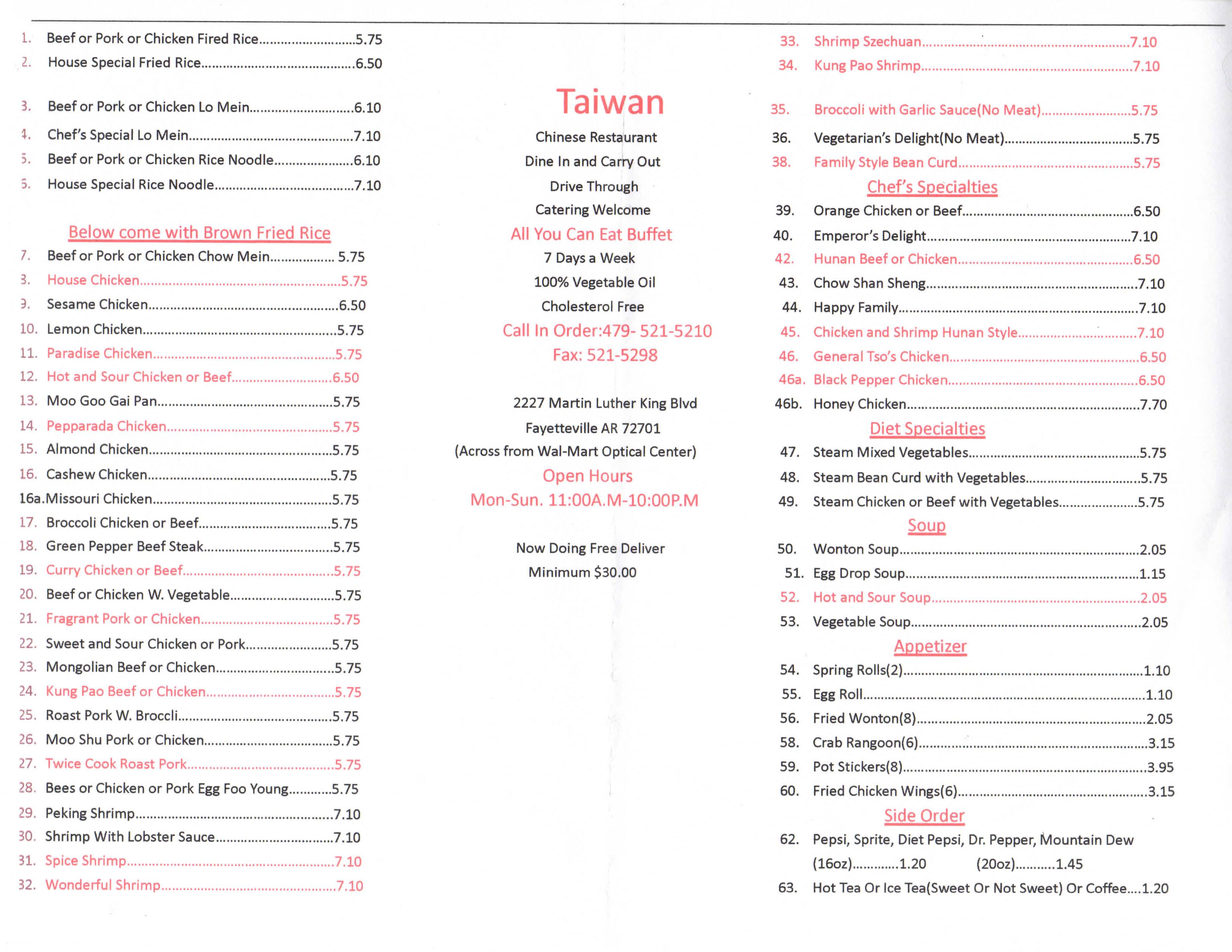 Menu Of Taiwan Chinese Restaurant Fayetteville Northwest Arkansas